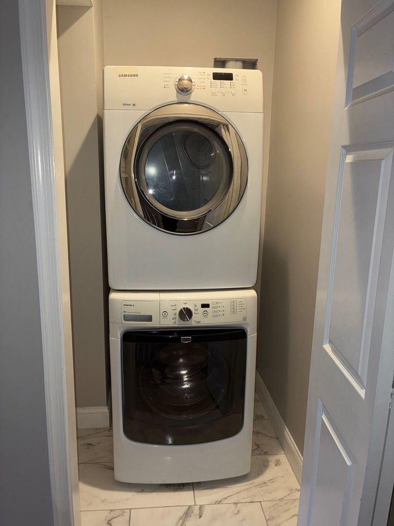 The updated kitchen includes stainless steel appliances and a dishwasher, and a washer & dryer are provided for added convenience.